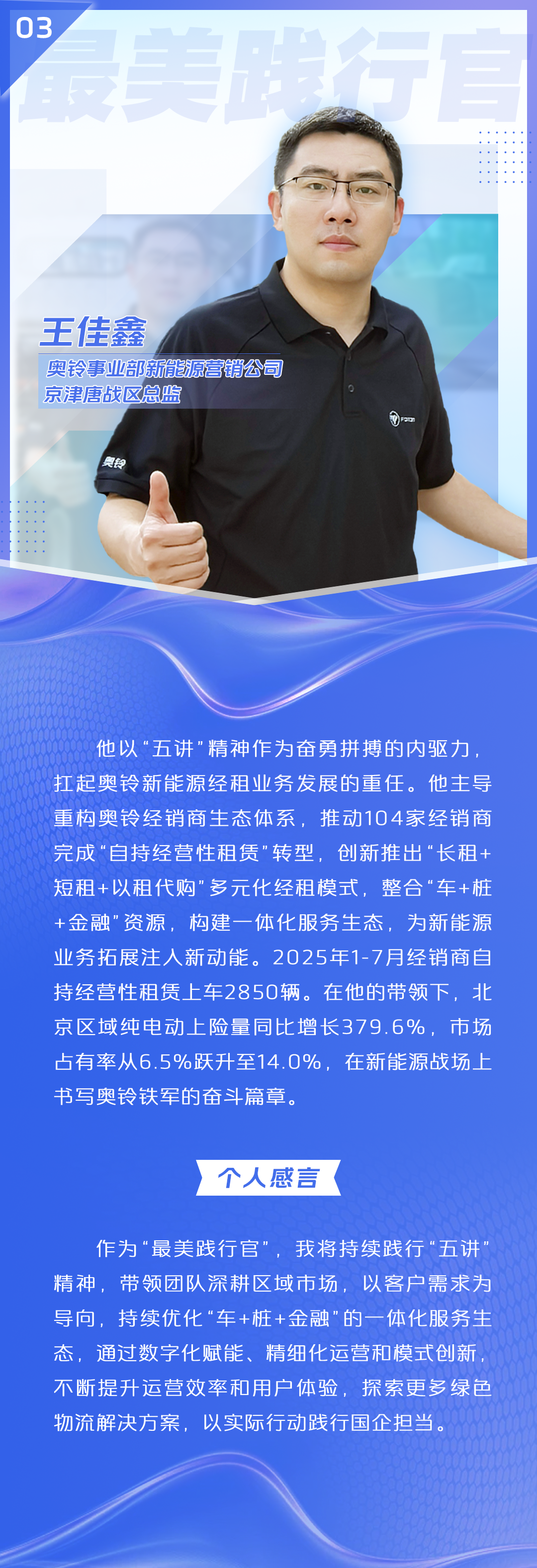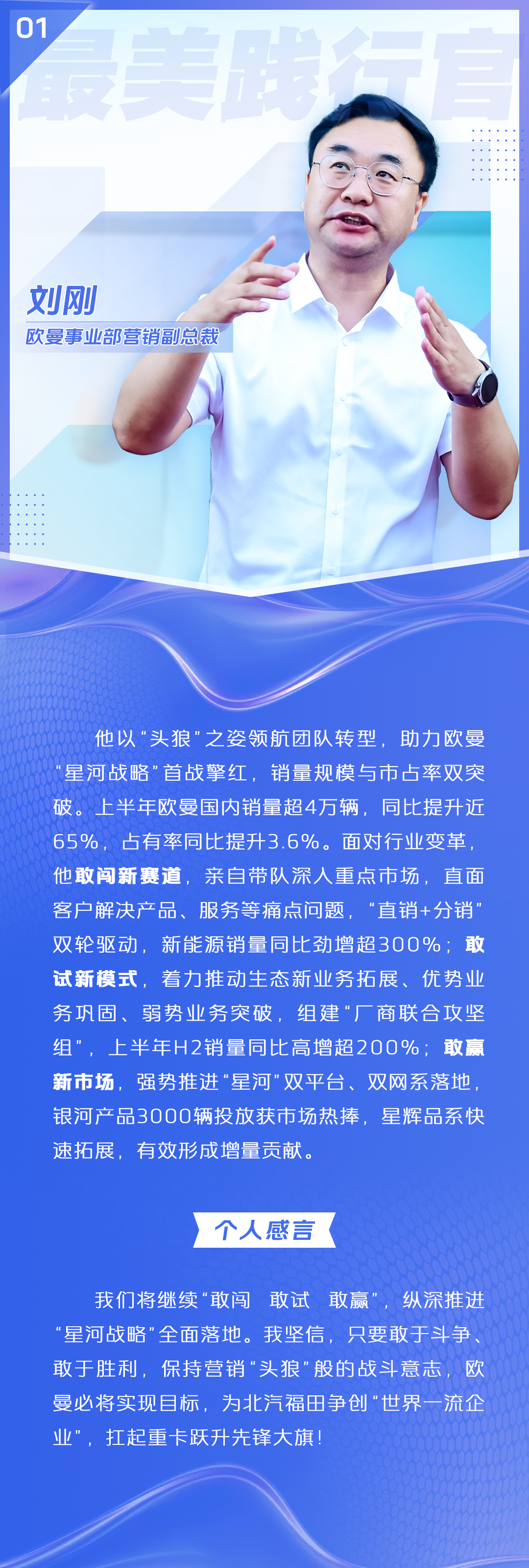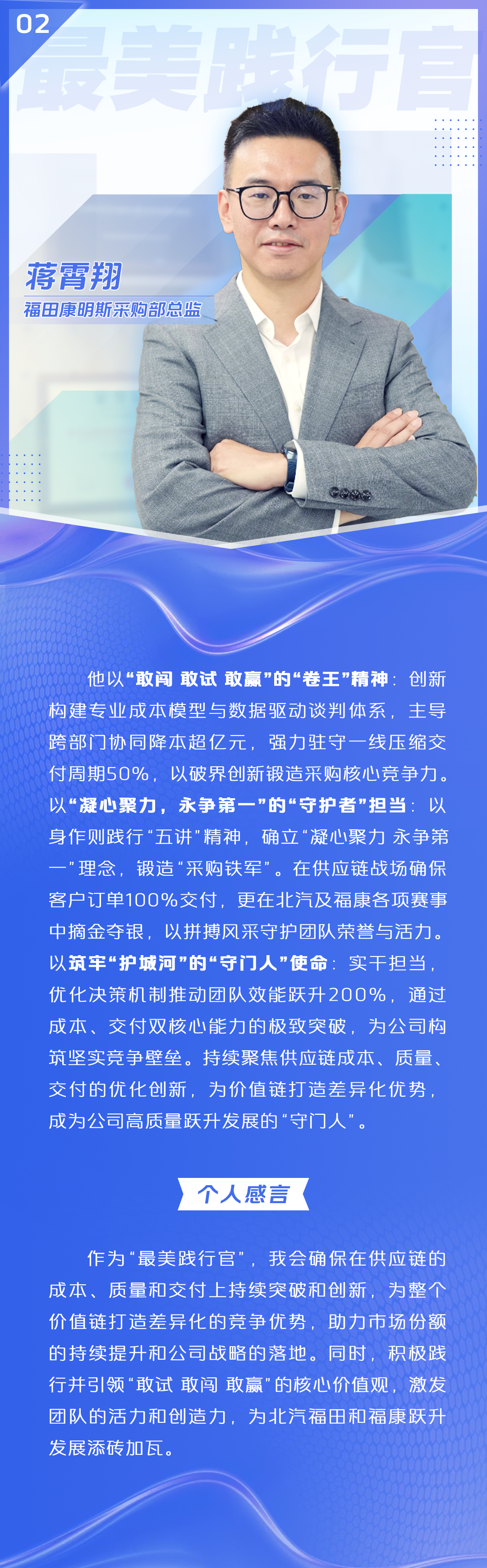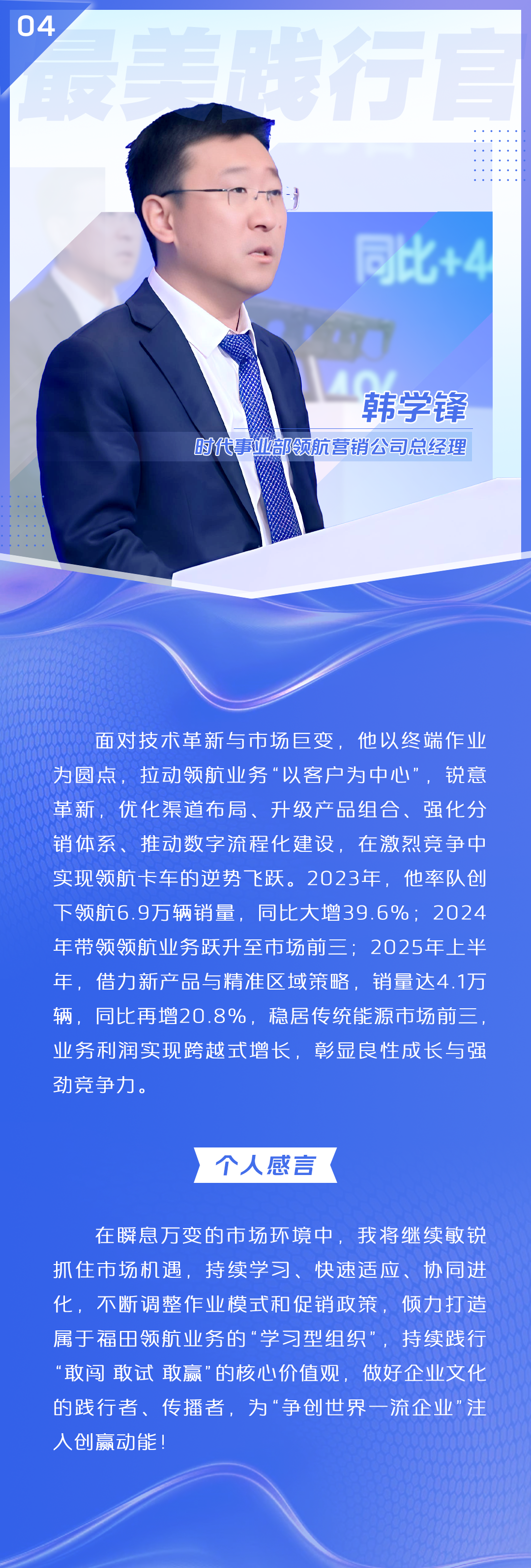 近期,2025年首批“最美践行官”认证评选活动火热开展,通过线上投票和线下推荐,累计参与人次达52W+。聚光灯下,10名“最美践行官”、5个“创赢案例”脱颖而出。他们当中,有“敢创赢”的“营销闯将”,让新能源销量飙升300%;有“新精专”的“研发精英”,攻坚液氢技术,树立新能源重卡标杆;有酣战智能制造的“国赛冠军”,在毫厘之间奏响“新质生产力”强音……他们以“敢闯 敢试 敢赢”的先锋姿态,诠释了平凡岗位的非凡价值,彰显了“福田践行官”即“中国奋斗者”的深刻内涵,为争创“世界一流企业”注入跃升动力!