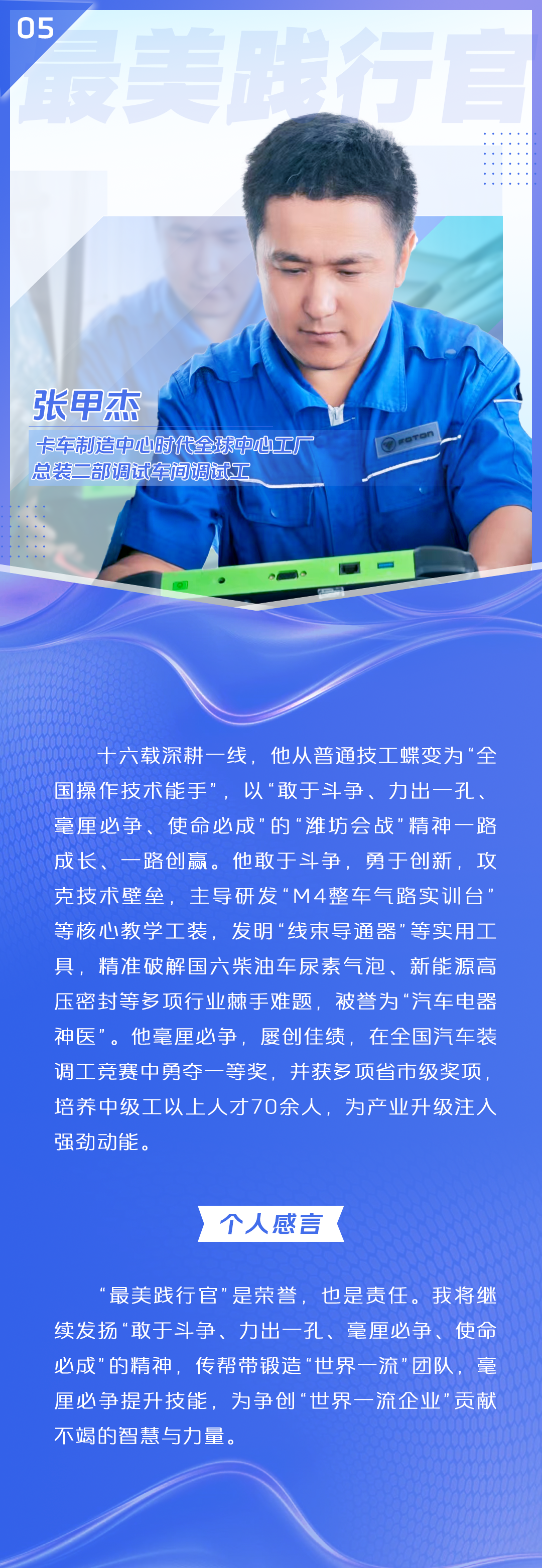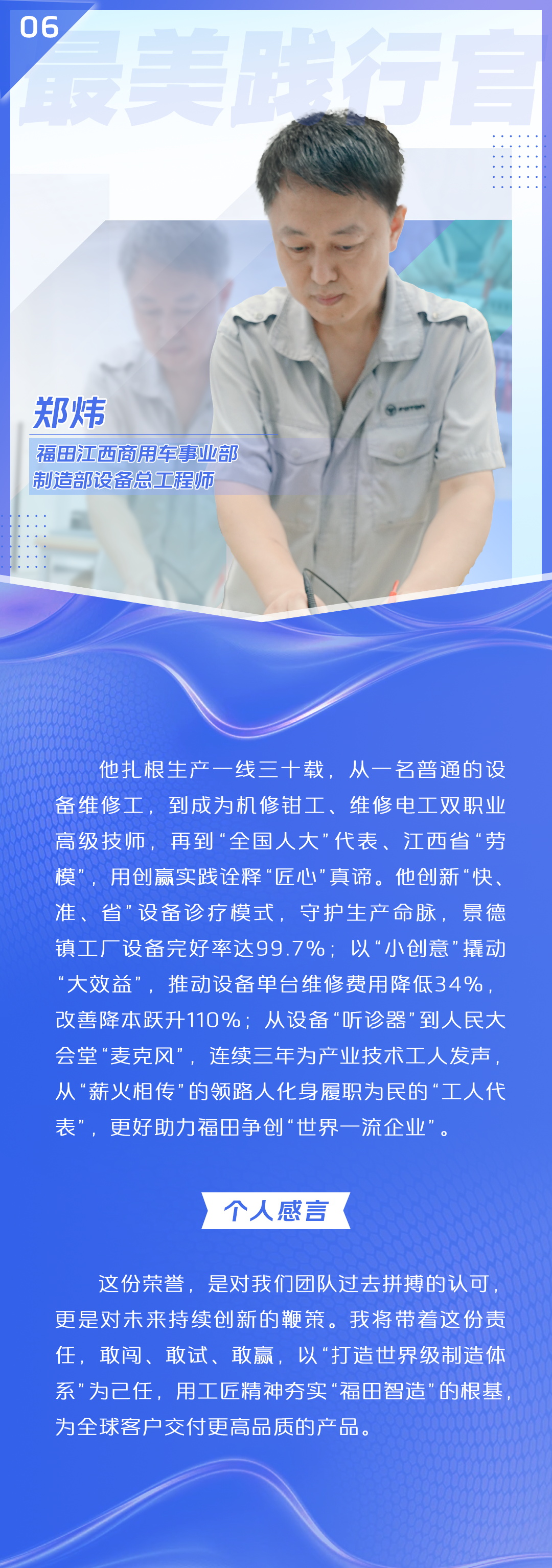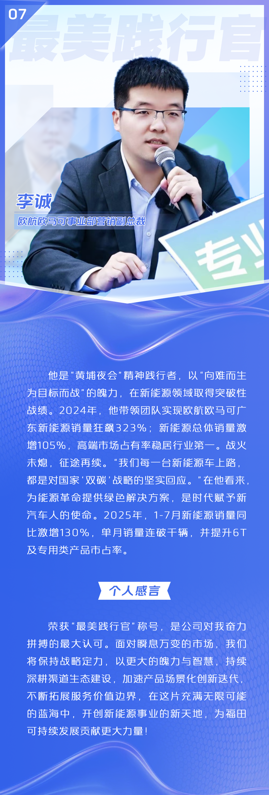 福田践行官,中国奋斗者。2025年,“最美践行官”文化品牌活动全新升级,聚焦国际化、新能源化、智能化等重点业务方向,推进价值型评选、深化裂变式宣传、升级暖心式表彰,号召全体福田人讲格局、讲竞争、讲责任、讲能力、讲业绩,向榜样学习、向标杆看齐,争做“福田践行官 中国奋斗者”,争创“世界一流企业”。